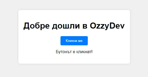 В следващите примери от код, ще покажа как трите основни технологии (HTML, CSS, JavaScript) си взаимодействат. Ще създадем страница, в която има бутон. При натискане на бутона, ще се покаже динамичен текст. Страницата ще изглежда по следния начин:
